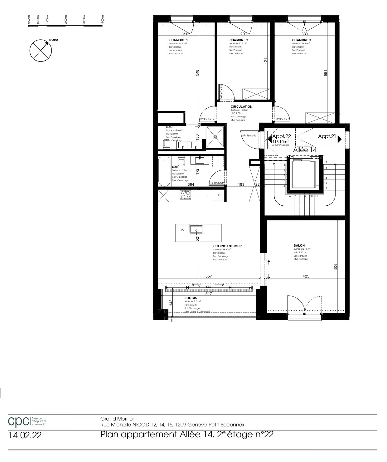 Appartement de 6 pièces situé au 2ème étage (allée 14), rue Michelle-Nicod 14, 1202 Genève.
